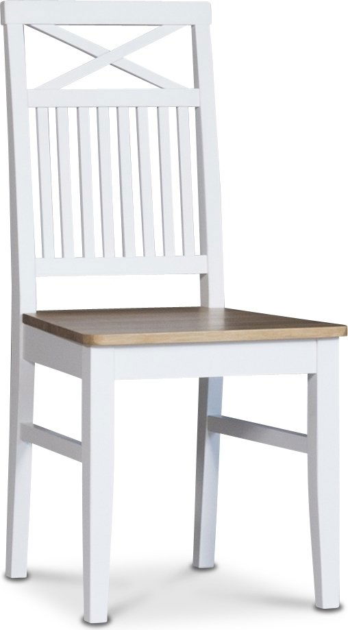 Matgrupp från Skånska Möbelhuset, matbord med ek-underrede och bordsskiva i massiv oljad ek. Fyra stycken Dalarös matstolar i vitlackat trä med kryss i ryggen.