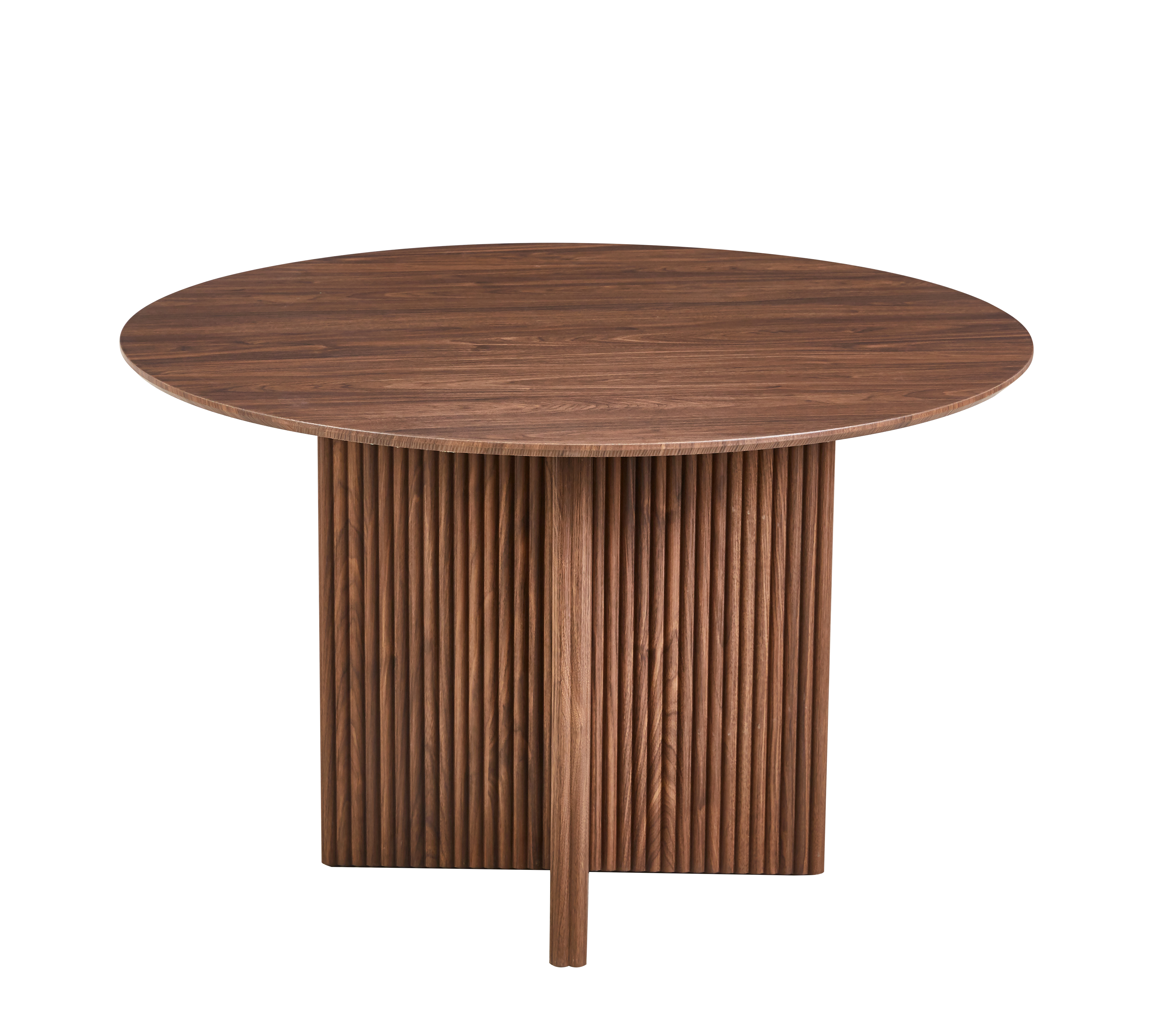 En elegant matgrupp som kombinerar modern design med varm valnötskaraktär. Crossby matbord har en rund bordsskiva i valnötsfolierad MDF och dekorativa räfflade bordsben i trä som ger en exklusiv och samtida känsla. Den rundade formen skapar en social och inbjudande samlingsplats som passar utmärkt för både vardagsmiddagar och festliga tillfällen.
