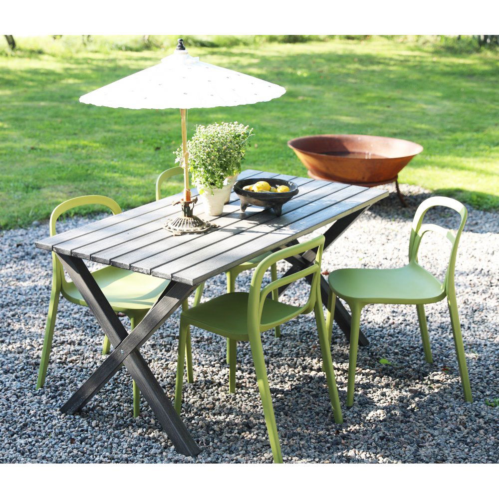 En nätt matgrupp till uteplatsen från Skånska Möbelhuset. Scottsdale runt bord Ø112 cm i diameter i grålaserad furu med 4 st stapelbara Nordanå stolar i grön formgjuten plast. En matgrupp i harmoni där möblerna går snyggt ihop och skapar en helhet som är svåröverträffad. Passar lika bra i uterummet som på altanen.