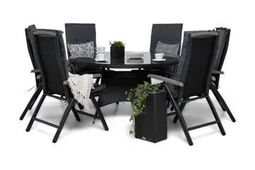 Monaco Matgrupp Utomhus 152-210 + 6 Jenny Ställbar Fåtölj m Dyna, Grå/Svart