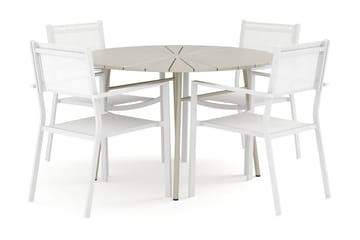 Tunis utomhus rund matgrupp 120 cm med 4 Tunis stapelstolar, Vit/Grå