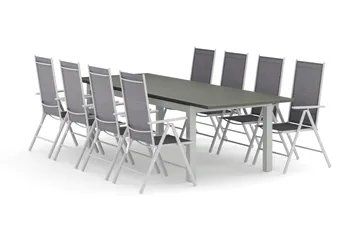 Monaco utomhus matgrupp förlängningsbart 210/310x90 med 8 Maggie positionsstolar, Vit/Grå