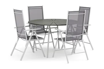 Tunis utomhus rund matgrupp 120 cm med 4 positionsstolar, Vit/Grå